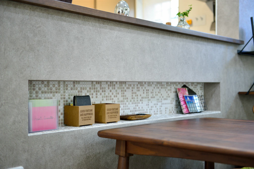 キッチン腰壁を利用したカウンター下のニッチ収納。 お好みのタイルを張って、小物を飾るとめちゃくちゃおしゃれです。