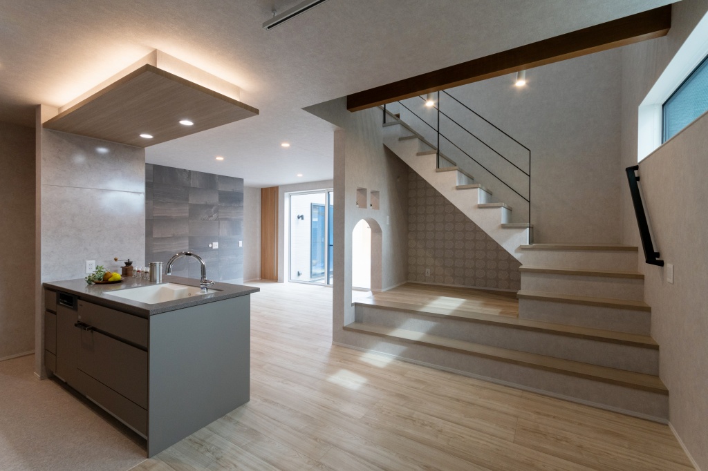 <家づくりPOINT> ◆家事と生活がラクになる回遊動線 LDKの中心にファミクロを設け、水廻り側からとリビング側からの2WAYアクセスができる配置に。 ぐるぐると回遊できるので必要なお部屋に最短距離でアクセス可能◎家事と生活の時短に役立つ神配置に! ◆こだわりのヌックスペース 階段下のスペースを有効活用し、ゆったりくつろげるヌックに。 アーチ型の開口からテレビ鑑賞を楽しめます。 ◆思い思いの時を過ごせるフリースペース 階段上にはベンチカウンターを造作したフリースペースを設けました。 お子さんはカウンターとして使用しここで勉強を、大人はベンチとして読書等を楽しむ予定。 家族が好きなタイミングで使える、フレキシブに使える空間に◎ 【注文住宅】 新築 木造二階建て 所在地 広島県福山市 延床面積 約40~45坪 敷地面積 約56坪 性能値 (Ua値0.38/C値0.25/Q値1.21) 竣工 2024年